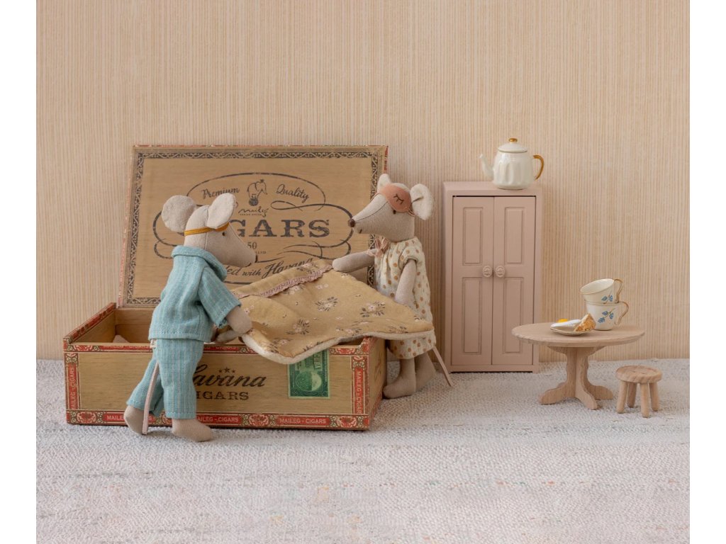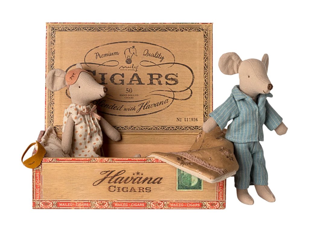 Myšky máma a táta v krabičce od oblíbené dánské značky Maileg. Mají na sobě krásné noční prádlo a masky na oči. Krabička na doutníky je perfektní postel pro skvělý spánek a sladké sny. Ložní prádlo se může barevně lišit.