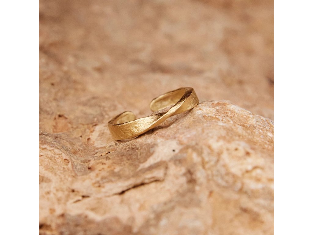 Prsten s elegantně překříženým designem vyniká svou jemnou strukturou a ručně působícím povrchem, který odráží světlo a dodává šperku charakter. Díky své nadčasové jednoduchosti se hodí k vrstvení s dalšími prsteny i k samostatnému nošení.